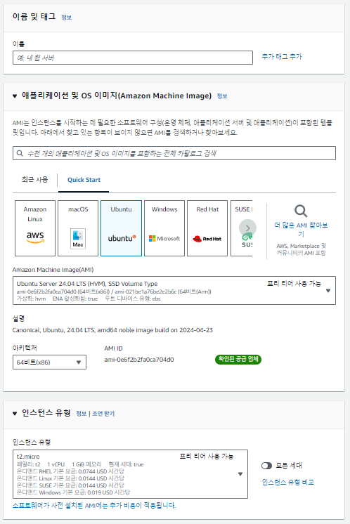 AMI ubuntu로 진행하였고, 인스턴스 유형 t2.micro 프리티어 체크하기!